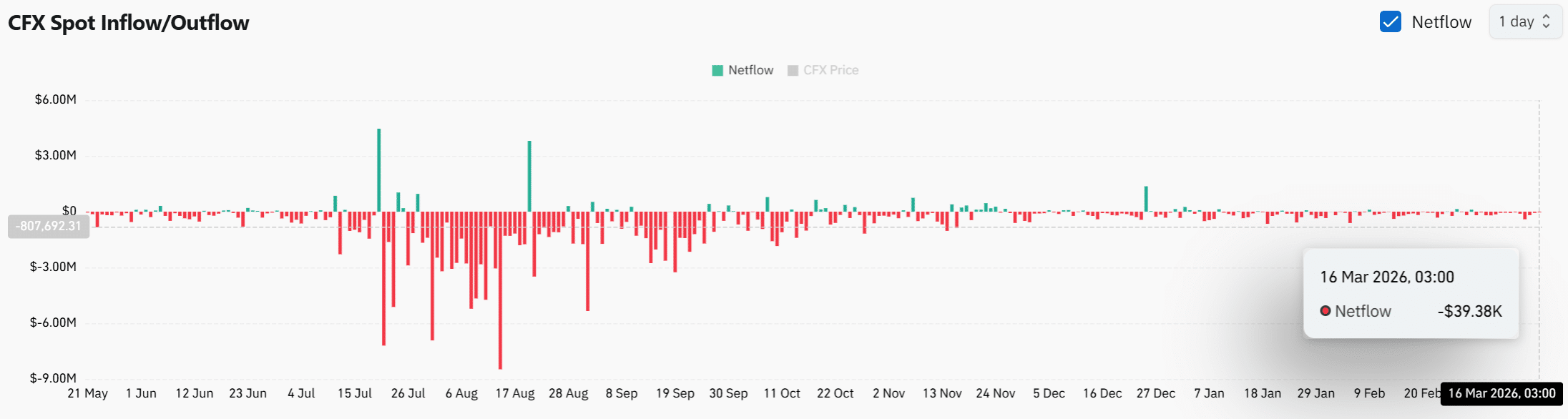 La actividad de flujo al contado ha revelado flujos netos negativos persistentes en los exchanges, lo que indica que CFX continuó saliendo de las plataformas de trading. El último flujo neto registrado mostró aproximadamente –$39.38K, reforzando la tendencia de salida continua visible en las últimas semanas.