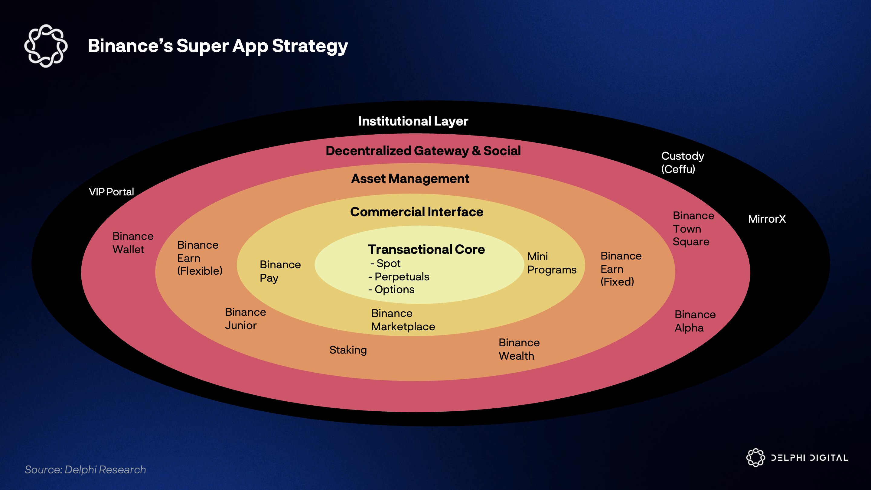 Delhi destaca a Binance como el ejemplo más claro del juego monolítico de la superapp, argumentando que refleja el modelo al estilo WeChat de "una interfaz, utilidad infinita".
