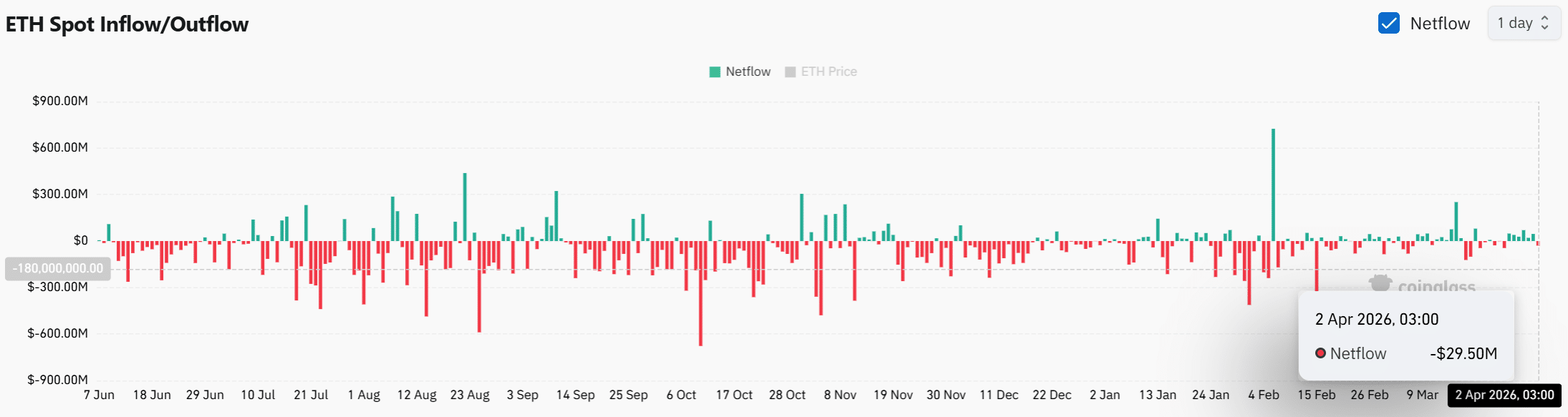 Mientras el precio continúa comprimiéndose, los Flujos Netos en Spot se mantuvieron negativos, con datos recientes mostrando una salida de $29.50 millones.