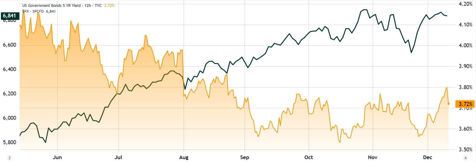 Los rendimientos del Tesoro estadounidense a 5 años se situaron en 3.72% el miércoles, frente al 4.10% de hace seis meses, mientras que el S&P 500 ganó un 13% en el mismo período. Los operadores se preocupan de que el crecimiento de la deuda del gobierno de EE. UU. pueda debilitar el dólar y avivar la presión inflacionaria, haciendo que la escasez relativa de las acciones sea más atractiva a pesar de las preocupaciones sobre las valoraciones extendidas.