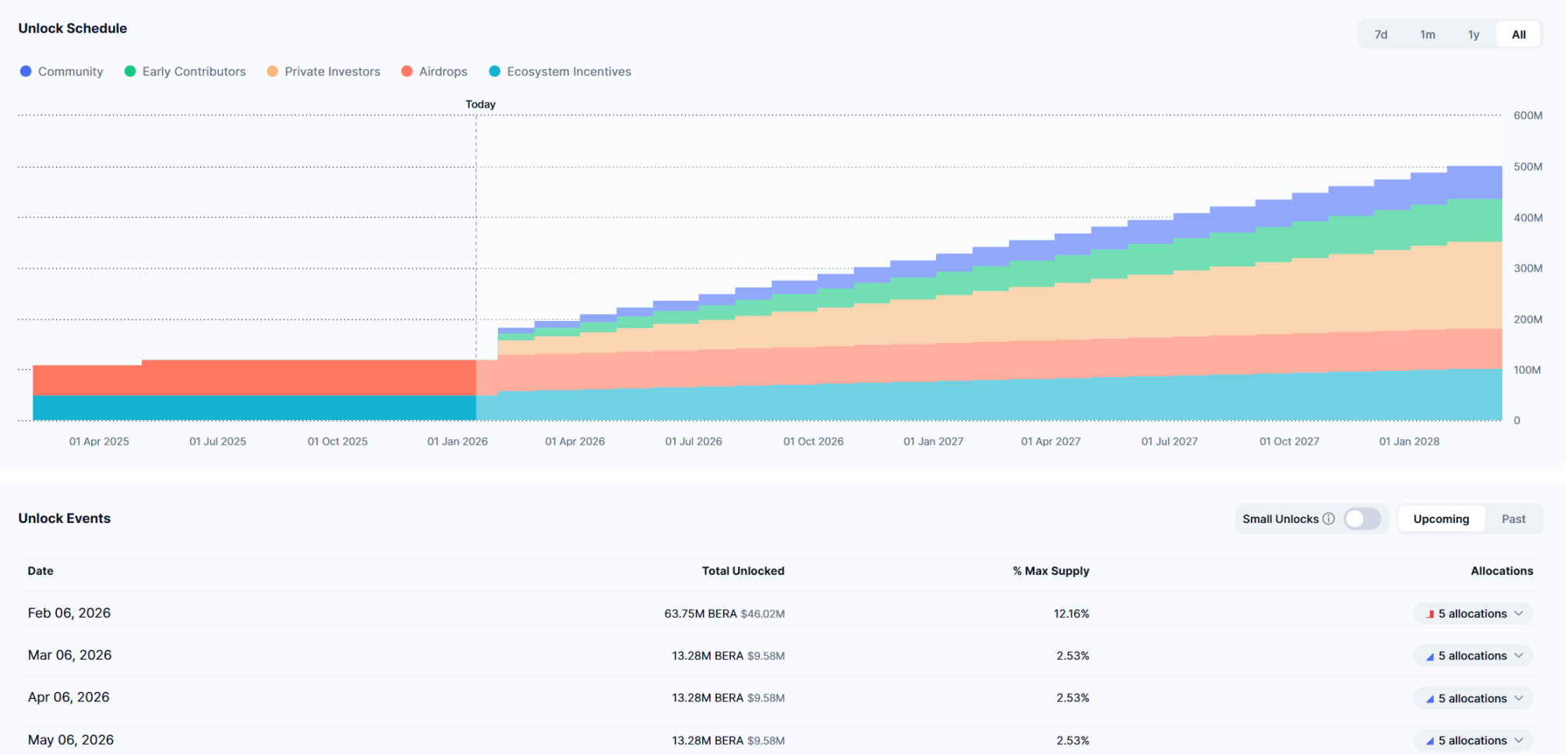 AEl 6 de febrero de 2026, Berachain desbloqueará 63.75 millones de tokens BERA, equivalentes al 12.16% de la oferta total, con 28.58 millones destinados a inversores privados. Esto podría generar una presión de venta significativa debido a la liquidez actualmente limitada.