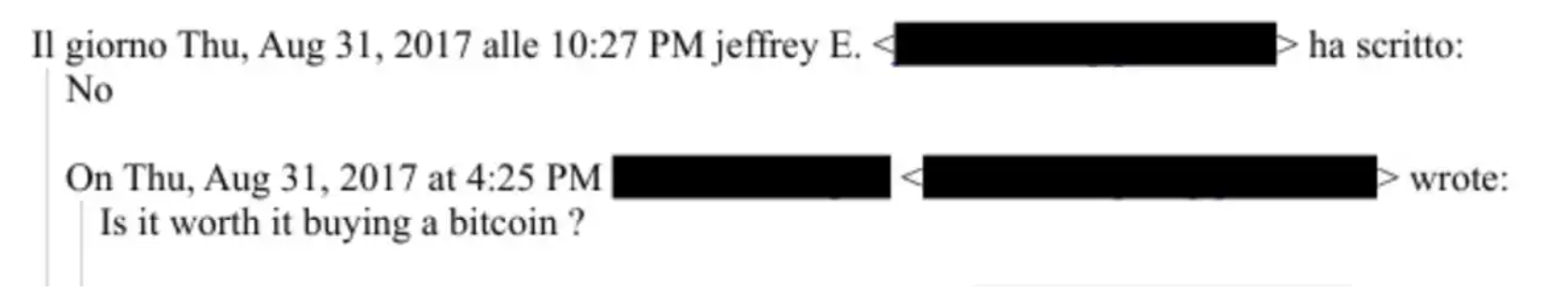 Si Epstein realmente conoció a Satoshi Nakamoto, parece que Satoshi no logró predicarle sobre Bitcoin durante su contacto con Epstein. En un correo del 31 de agosto de 2017, al responder a la pregunta «¿Vale la pena comprar un Bitcoin?», respondió directamente «No». Y en ese momento, un Bitcoin costaba menos de 5000 dólares.