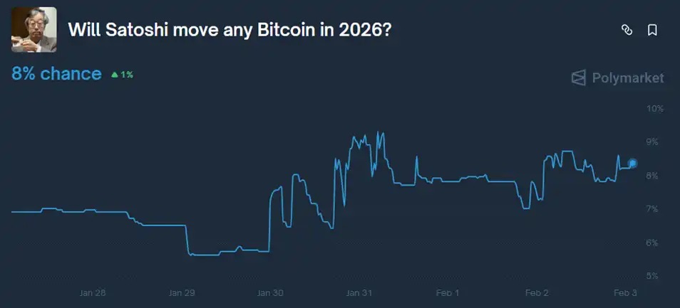 Después de la divulgación de este último lote de archivos de Epstein, la posibilidad de «que la dirección de Bitcoin de Satoshi Nakamoto tenga movimiento en 2026» en el mercado de predicción Polymarket aumentó de aproximadamente 6% a aproximadamente 9.3%, y actualmente se mantiene en 8%.