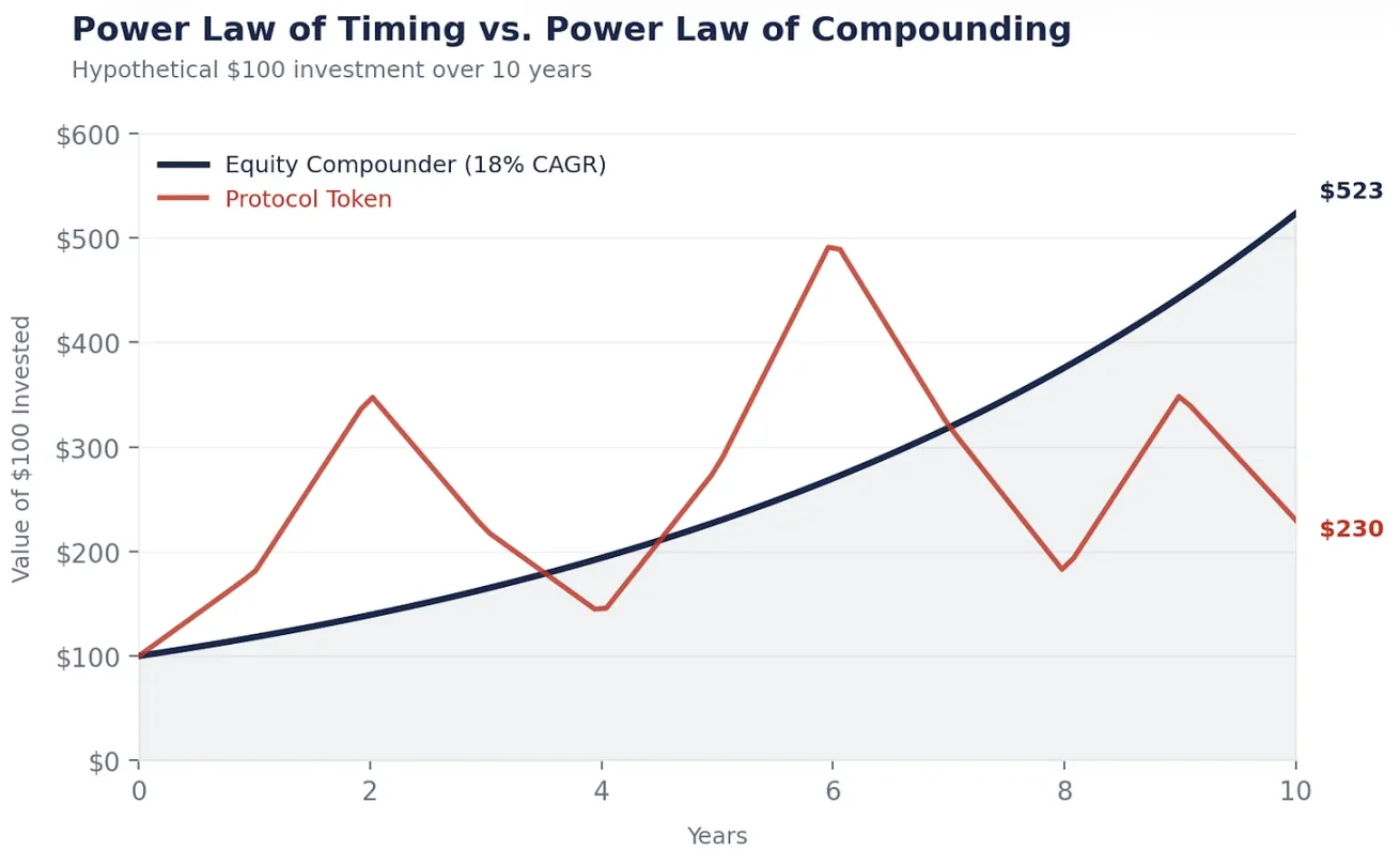 Hasta entonces, el capital inteligente continuará fluyendo hacia las acciones, y la brecha de interés compuesto entre tokens y acciones se ampliará cada año.