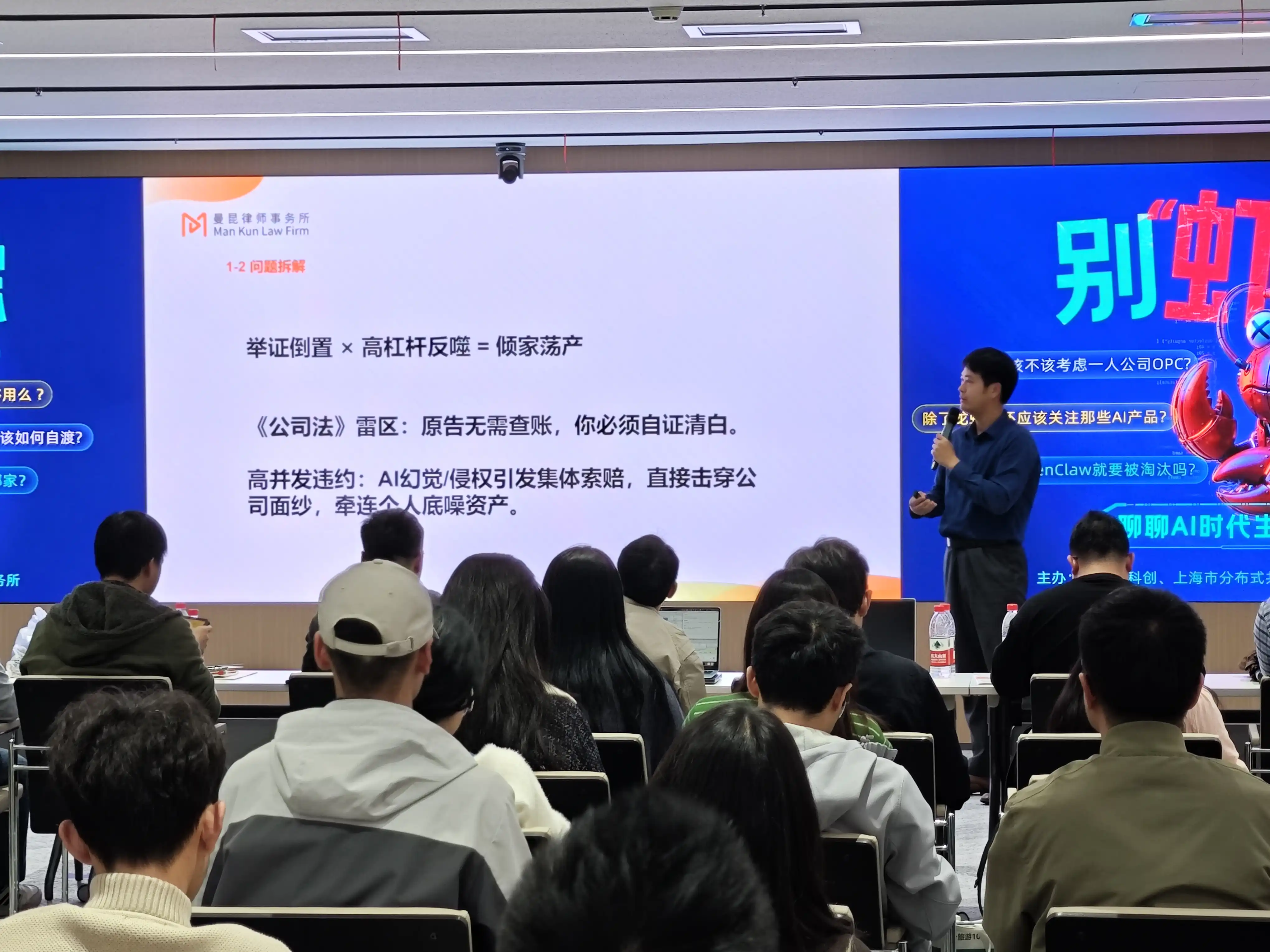 Zhao Xuan, abogado socio de Mankun Law Firm, en su conferencia temática, compartió tres grandes problemas legales que los emprendedores deben considerar en la era de la IA y sus soluciones. El primero es la "cáscara organizativa", es decir, el "aislamiento falso" creado por las empresas unipersonales (OPC), que superficialmente forman una entidad independiente, pero en realidad es difícil aislar verdaderamente la responsabilidad y el riesgo; es necesario establecer un aislamiento físico y legal real, incluyendo la introducción de socios en la estructura, el uso de tarjetas de crédito corporativas exclusivas y la inserción de cláusulas de exención de responsabilidad por IA y límites de indemnización en los contratos. El segundo es el problema de la propiedad de los activos centrales; el esfuerzo no equivale a derechos, es necesario demostrar el derecho de propiedad, registrar completamente el proceso de creación y almacenar pruebas. El tercero es el riesgo sistémico de "desconexión" provocado por la hegemonía de las plataformas, incluyendo cláusulas abusivas, bloqueo técnico, etc.; se deben separar los datos centrales de los servicios de terceros, planificar con antelación alternativas e introducir tecnología descentralizada.