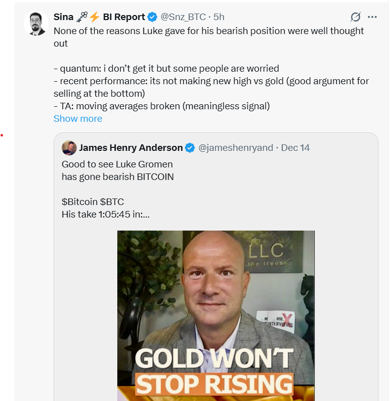 Sin embargo, los analistas especializados en Bitcoin están lejos de estar convencidos por el argumento bajista a corto plazo de Gromen, desestimando sus razones por no estar bien pensadas y argumentando que citar medias móviles rotas y un rendimiento inferior frente al oro es una forma clásica de vender en la debilidad en lugar de identificar un techo.