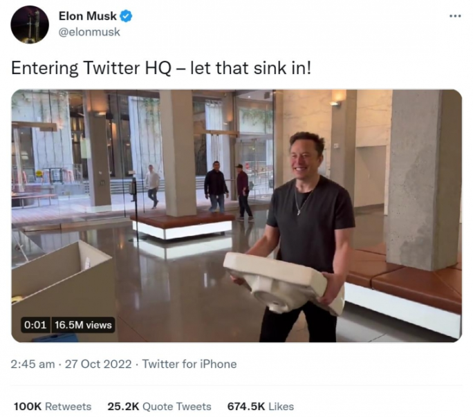 El 27 de octubre de 2022, Musk entró al edificio principal de Twitter con un lavamanos en la mano.