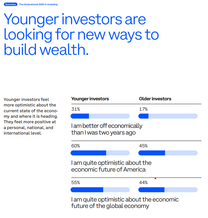 El informe sugiere que esto se debe tanto al acceso como a la actitud. Casi tres cuartas partes de los adultos más jóvenes (73%) creen que es más difícil para su generación generar riqueza a través de medios tradicionales, en comparación con el 57% de los encuestados mayores.