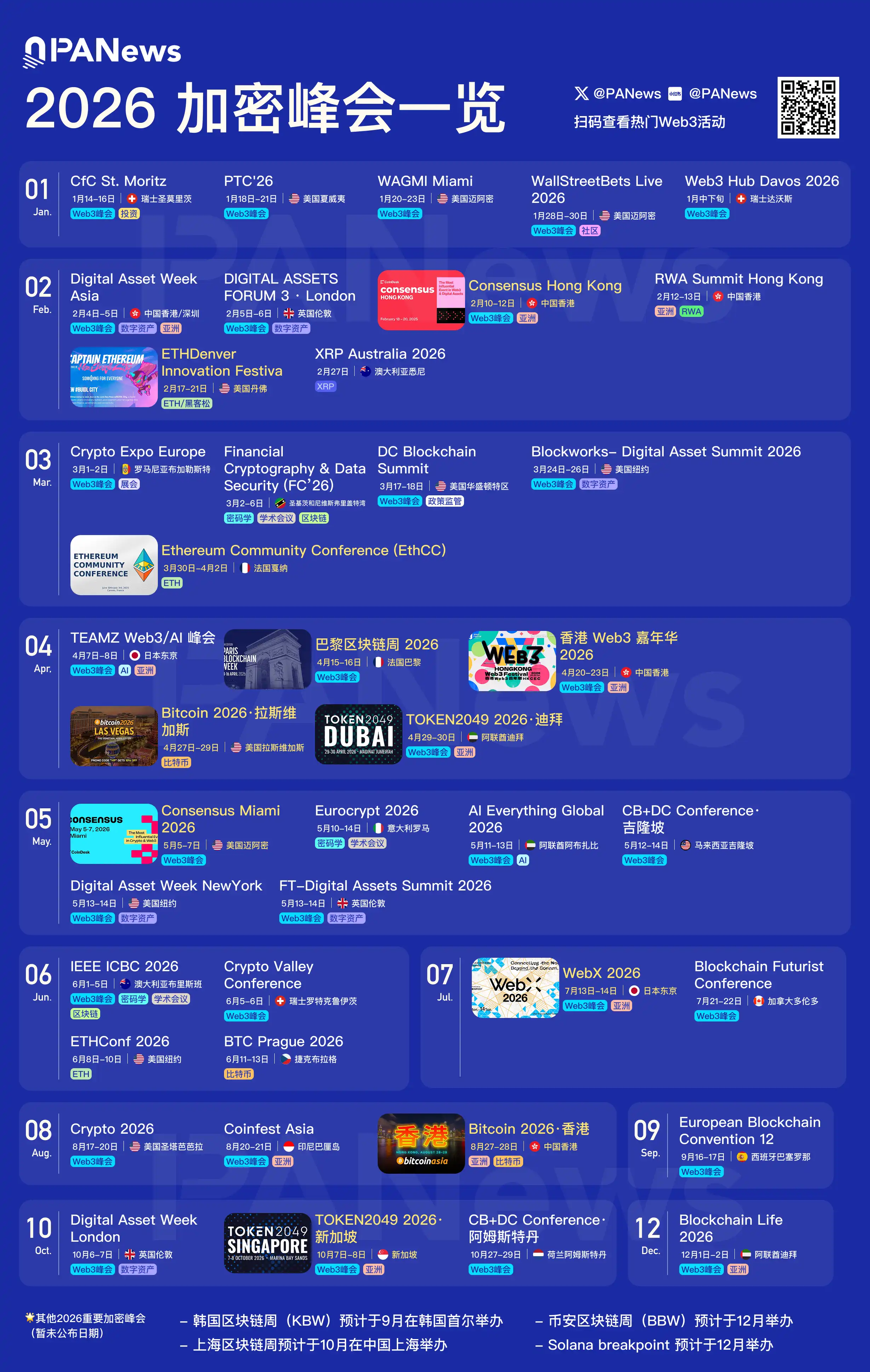 📖 Para ayudar a todos a planificar mejor el itinerario de 2026, PANews ha compilado esta línea de tiempo anual de cumbres cripto, cubriendo ciudades clave en Norteamérica / Europa / Asia / Medio Oriente. Un vistazo para dominar el ritmo anual, ver claramente en qué meses se concentran las conferencias importantes de 2026 y bloquear con anticipación las conferencias líderes de la industria y los nodos de comunicación de alta densidad.