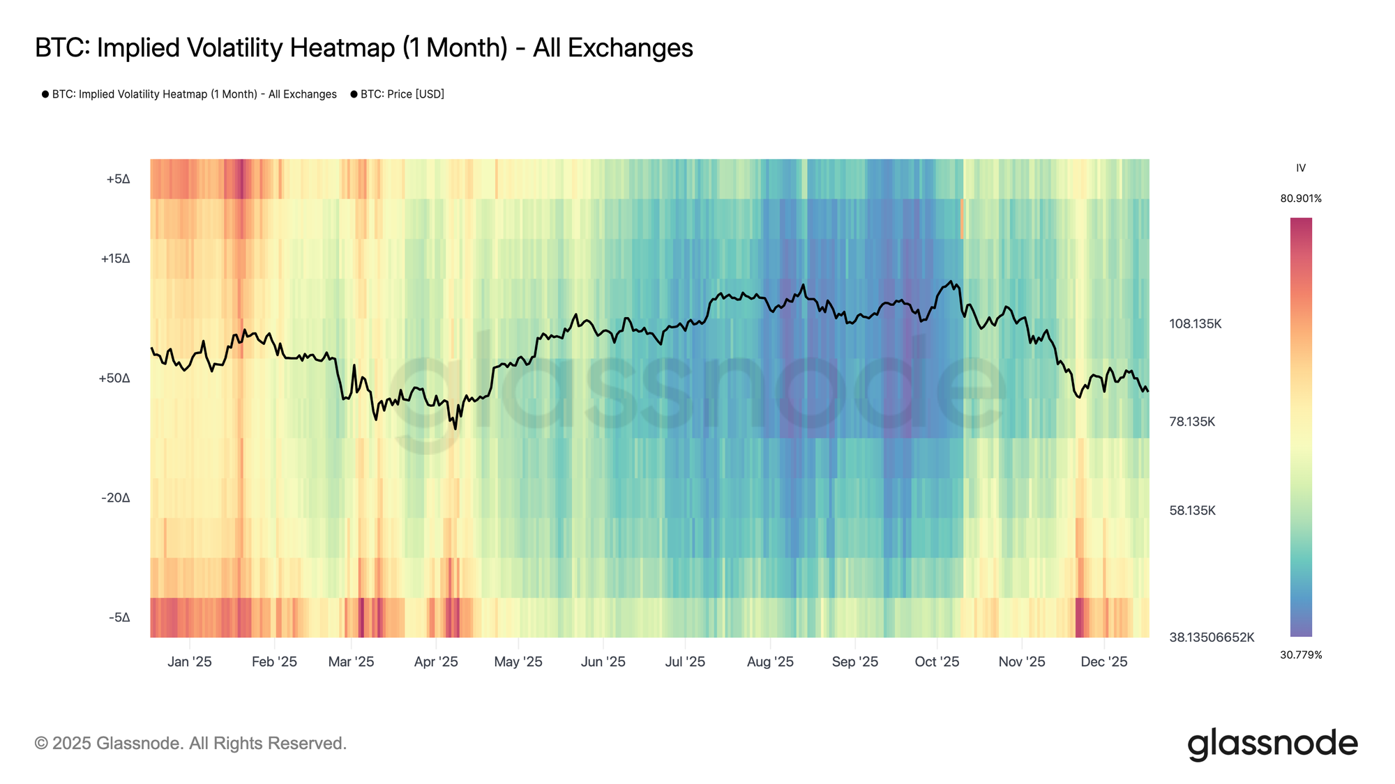 Para una perspectiva más amplia y de una sola vista, también ofrecemos mapas de calor de IV que muestran la superficie completa de volatilidad implícita en un gráfico. El eje vertical representa el delta de la opción, con valores positivos correspondientes a opciones call y valores negativos a opciones put, permitiendo una comparación directa de la volatilidad alcista y bajista a través de deltas y tenores. Esto facilita detectar asimetrías de skew, valoración de riesgo de cola y dislocaciones de volatilidad relativa de un vistazo.