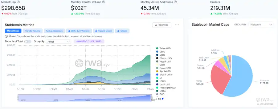La capitalización total de mercado de las stablecoins alcanzó los 2,986.5 mil millones de dólares, una ligera disminución del 0,6% interanual, con el tamaño total contrayéndose continuamente; el volumen mensual de transferencias aumentó significativamente a 7,02 billones de dólares, un crecimiento del 29,04% interanual, mostrando una mejora notable en la eficiencia de rotación de los fondos en stock; el número total de direcciones activas mensuales disminuyó a 45,34 millones, una ligera caída del 0,11% interanual; el número total de titulares aumentó de manera estable a aproximadamente 219 millones, un ligero aumento del 4,98% interanual. La continua divergencia entre ambos indica que el mercado presenta una diferenciación estructural de "liquidación de alta frecuencia impulsada por instituciones y estancamiento de la actividad minorista".