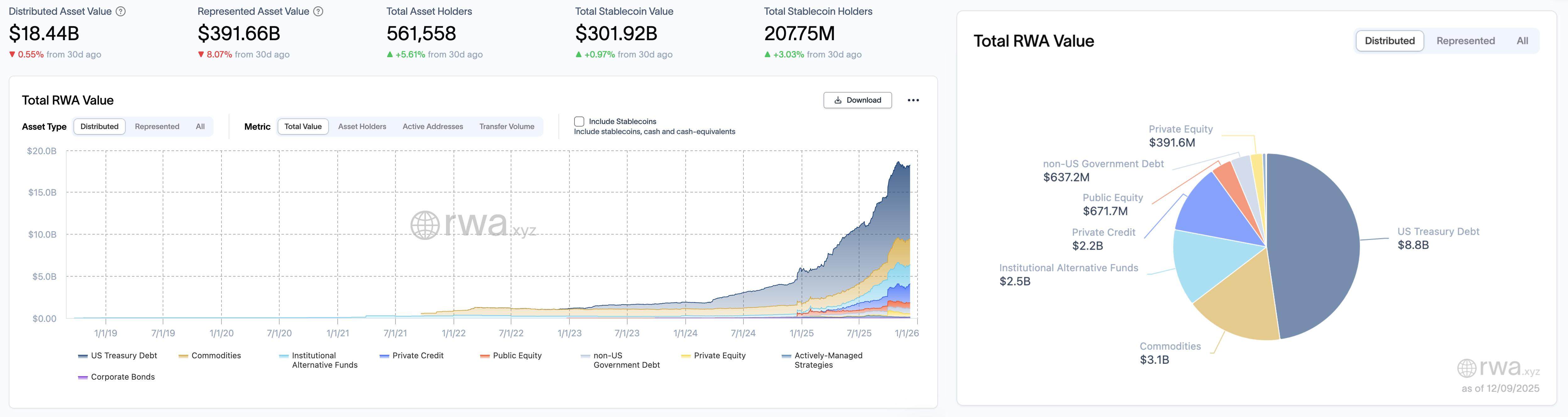 Según el panel de datos de rwa.xyz, al 9 de diciembre de 2025, el valor total en cadena de RWA (Distributed Asset Value) se estabilizó notablemente esta semana después de las fuertes fluctuaciones de la semana pasada causadas por un ajuste en los criterios de medición. Los datos muestran que el valor total aumentó ligeramente, de 184.100 millones de dólares el 2 de diciembre a 184.400 millones de dólares, un incremento de aproximadamente 300 millones de dólares, con una subida mínima. Al mismo tiempo, el valor de los activos representativos (Represented Asset Value) creció de forma paralela, de 3915.500 millones de dólares a 3916.600 millones de dólares, lo que confirma de manera indirecta la resiliencia del volumen del mercado RWA en sentido amplio. El impulso de crecimiento en el lado del usuario sigue siendo rápido: el número total de titulares de activos aumentó de 555.428 a 561.558 personas, con 6.130 nuevos titulares en una sola semana, un incremento de aproximadamente el 1,1%. En cuanto al mercado de stablecoins, la capitalización de mercado total subió aún más, de 3009.900 millones de dólares a 3019.200 millones de dólares, un aumento de 9300 millones de dólares; el número de titulares de stablecoins se disparó en 2,06 millones de personas, pasando de 205,69 millones a 207,75 millones de personas, lo que proporciona un poder de compra potencial extremadamente abundante para los activos en cadena.