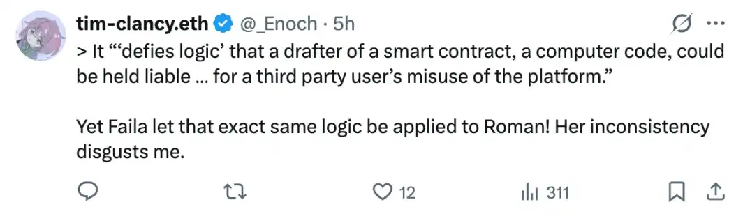 Brian Nistler dijo en un tuit que, citando una frase de la sentencia anterior, que los redactores de contratos inteligentes tuvieran que ser responsables del uso indebido de la plataforma por parte de usuarios terceros "va en contra de la lógica".