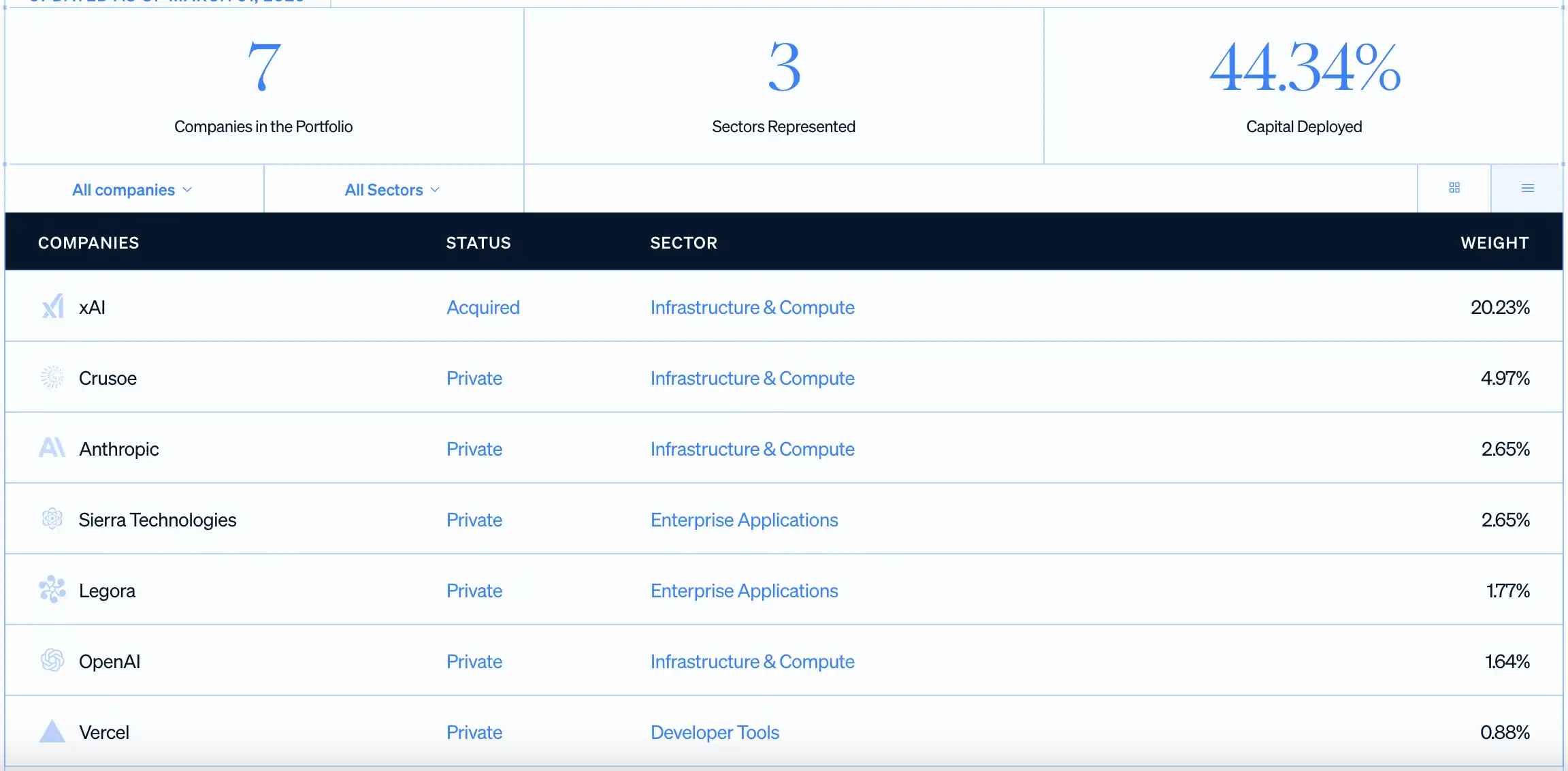 Por eso menciona constantemente nombres como OpenAI, Anthropic, xAI, Vercel. La página de cartera del sitio web muestra que, al 31 de marzo de 2026, USVC había desplegado el 44.34% de su capital, con 7 empresas en cartera. La mayor participación individual es xAI, seguida de Crusoe, Anthropic, Sierra, Legora, OpenAI y Vercel. Independientemente del rendimiento final de estas participaciones, el mensaje que AngelList quiere transmitir a los inversores es claro: antes solo veías estos nombres en las noticias, ahora puedes tener algo de exposición a ellos antes de que cotizen, a través de un fondo.