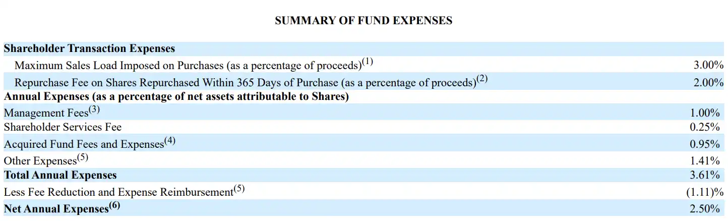 Segundo, este acceso tiene un costo, y no es bajo. La tabla de tarifas en la página 20 del Prospecto muestra que USVC tiene una tarifa de gestión del 1.00%, una tarifa de servicio al accionista del 0.25%, tarifas y gastos de fondos subyacentes del 0.95%, otros gastos del 1.41%, lo que suma una tasa anual total del 3.61%. Tras la exención de tarifas (vigente al menos hasta el 29 de octubre de 2026), la tasa anual neta es del 2.50%. Al analizar los costos operativos y los vehículos de capital de riesgo subyacentes, los inversores se enfrentan a un producto cuya tasa neta actual no es precisamente baja.