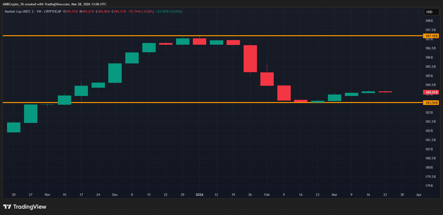USDT ha estado estancado alrededor de la marca de $184 mil millones durante más de un mes, lo que se alinea bastante de cerca con la consolidación lateral de Bitcoin entre $65k y $73k. Esto muestra cuán estrechamente conectados están los movimientos de Tether y BTC.