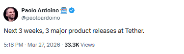 Naturalmente, eso hace que los próximos lanzamientos de productos de Tether sean aún más interesantes. En una publicación reciente en X, el CEO Paolo Ardoino insinuó tres nuevos productos que se lanzarán en las próximas tres semanas, señalando que Tether está redoblando su apuesta por la innovación y el posicionamiento en el mercado.