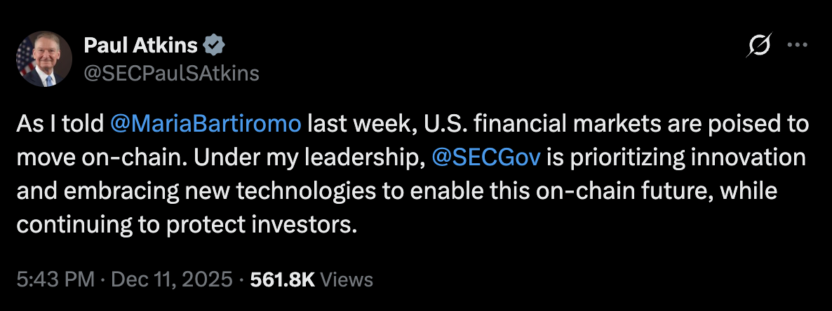"Los mercados financieros de EE. UU. están listos para pasar a la cadena (onchain)", dijo el jueves el presidente de la SEC, Paul Atkins, añadiendo: "Los mercados onchain traerán mayor predictibilidad, transparencia y eficiencia para los inversores".