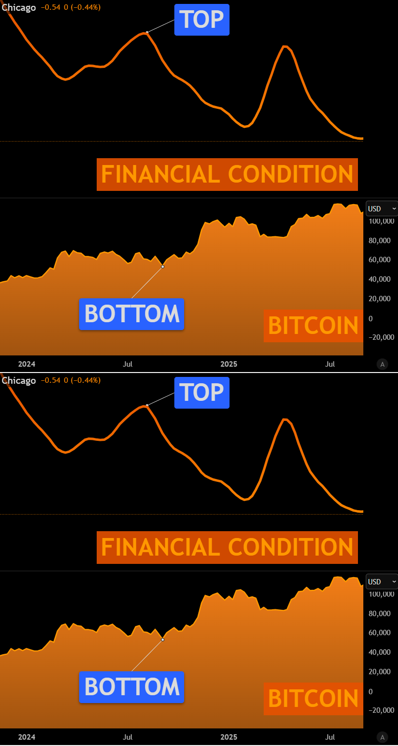 Esta señal apareció a finales de 2022 y mediados de 2024, ambos antes de fuertes repuntes. Históricamente, cada disminución de 0.10 puntos se ha alineado con aproximadamente un 15%-20% de alza en Bitcoin, con lecturas más profundas del NFCI marcando fases prolongadas de tendencia alcista de BTC.