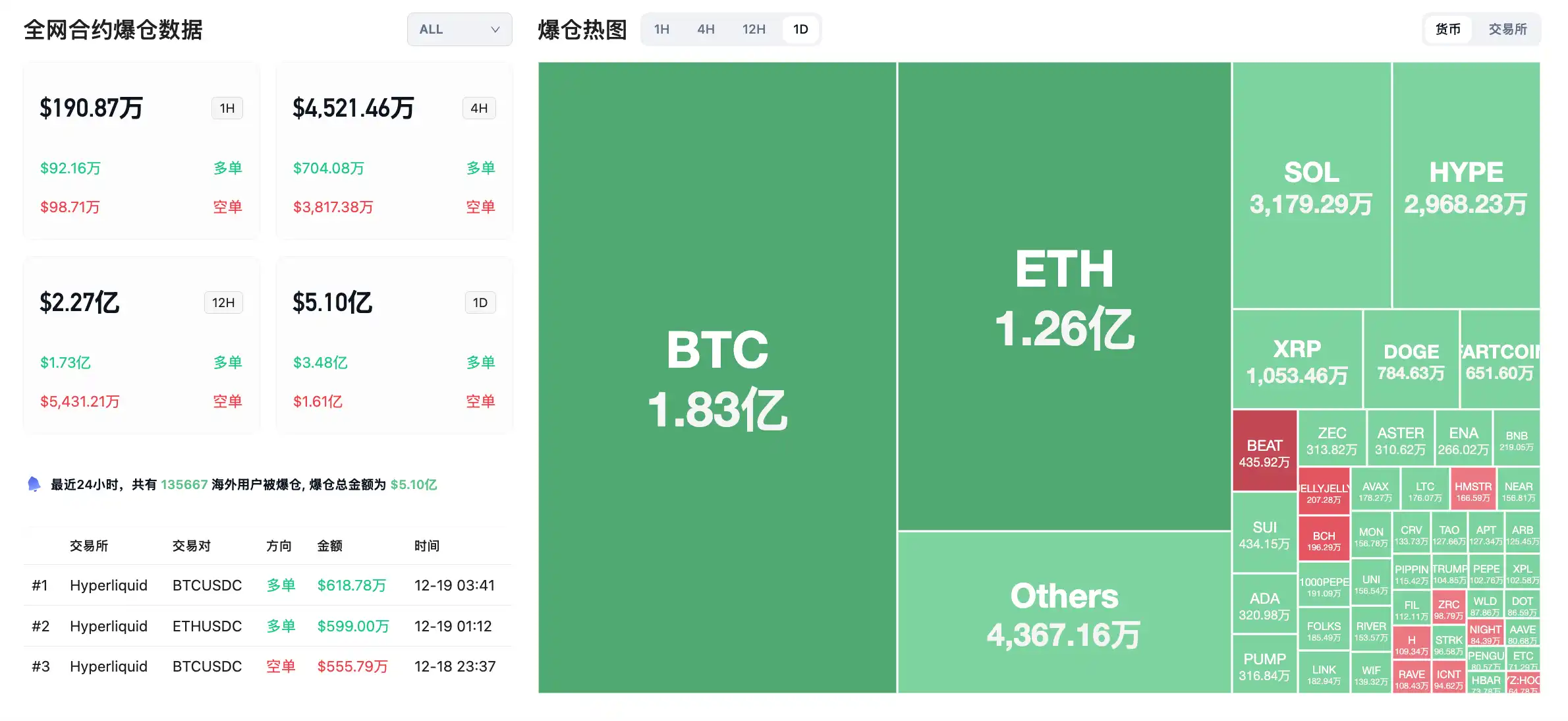 Datos de liquidación en 24h: 135,667 personas liquidadas globalmente, monto total liquidado de 510 millones de dólares, incluyendo liquidaciones de BTC por 183 millones de dólares, ETH por 126 millones de dólares, SOL por 31.79 millones de dólares