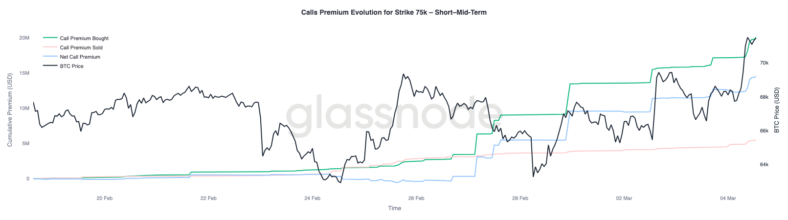 Mirando las dinámicas de prima para las calls de 75.000$ a través de los próximos tres vencimientos mensuales, se han negociado aproximadamente 14,5 millones de dólares en prima neta de calls. Esto representa la diferencia entre la prima comprada y la prima vendida.