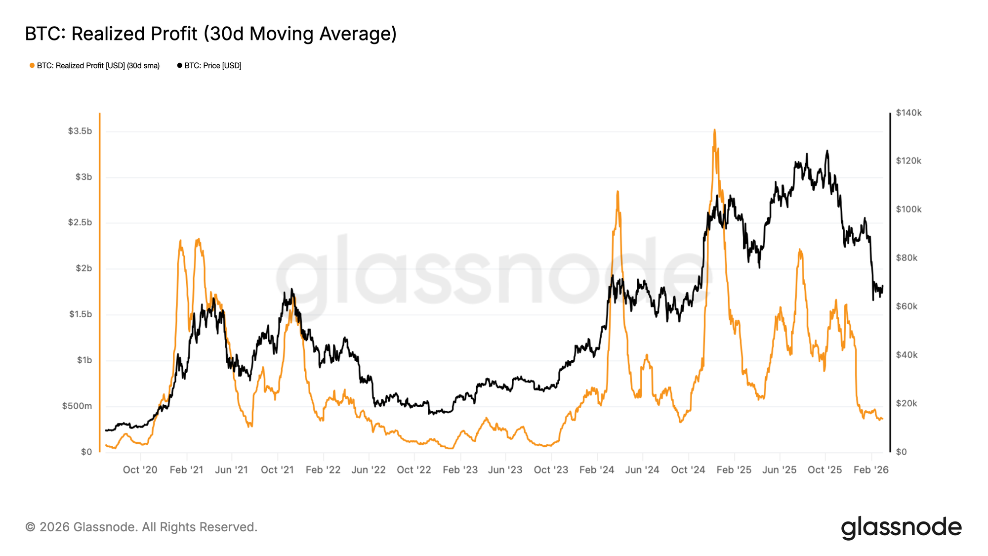 Mientras el precio se estabilizaba por debajo del umbral de 70.000 dólares, este indicador se contrajo bruscamente, pasando de más de 1.000 millones de dólares diarios a aproximadamente 370 millones de dólares diarios, un descenso de aproximadamente el 63%. Esta compresión en el beneficio realizado promediado mensualmente señala que el grupo de compradores dispuestos a operar con una prima se ha reducido materialmente, con la liquidez del lado comprador ahora en su punto más débil desde el período de agosto-septiembre de 2024.