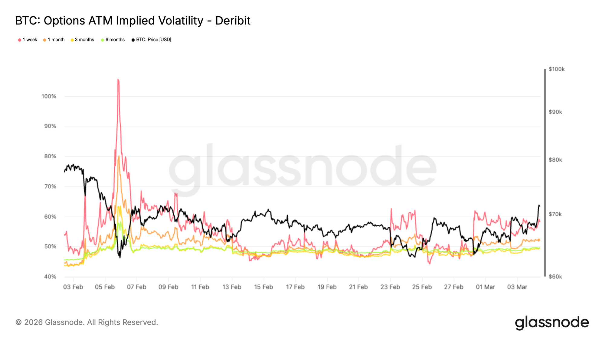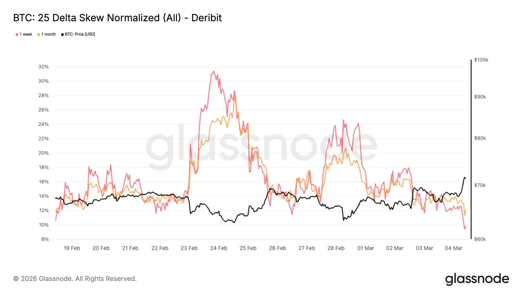 La volatilidad implícita ha continuado comprimiéndose tras el pico observado a principios de febrero. A través de los principales plazos, la IV ATM se ha movido materialmente a la baja, indicando que los operadores ya no están fijando agresivamente el riesgo de cola.