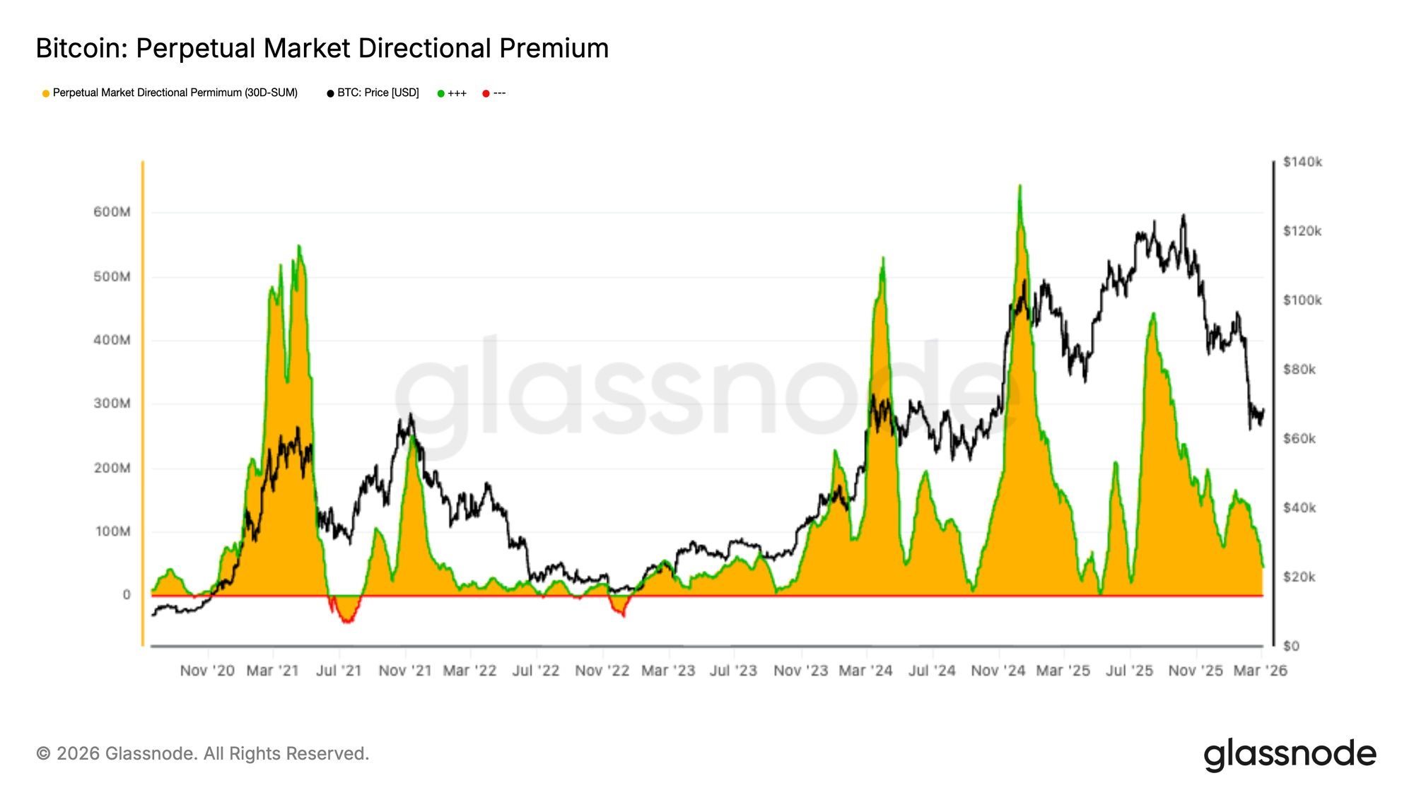La Prima Direccional del Mercado Perpetuo continúa tendiendo a la baja, reflejando una reducción sostenida del posicionamiento alcista en los mercados de futuros perpetuos. La métrica ha declinado constantemente en las últimas semanas a medida que el apalancamiento y la convicción direccional se han enfriado junto con la caída general del mercado.