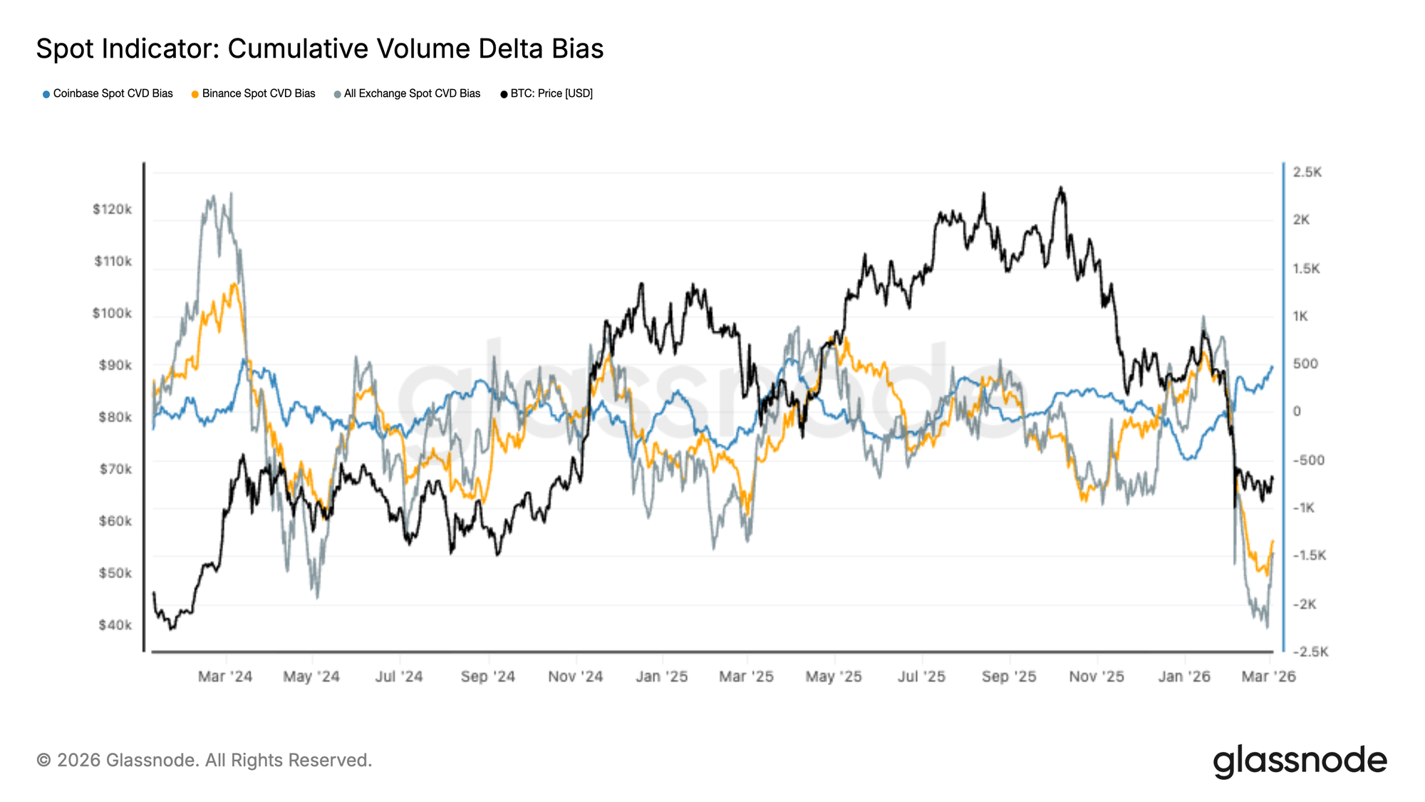 Este cambio insinúa que la fase más intensa de la distribución impulsada por el contado puede estar cediendo. No obstante, una recuperación sostenida probablemente requerirá una mejora más amplia en la absorción de ofertas al contado a través de múltiples exchanges antes de que dinámicas de acumulación más fuertes puedan afianzarse.