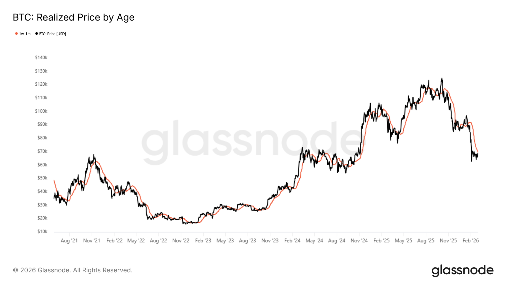 Una herramienta práctica en cadena para calibrar el punto de agotamiento potencial de tales repuntes es el Coste Base de los Tenedores a Corto Plazo, específicamente para monedas con antigüedad entre una semana y un mes. Esta cohorte representa la ola más reciente de participantes del mercado, cuyo precio de adquisición actúa como un ancla conductual clave: en las etapas más profundas de un mercado bajista, los rebotes locales tienden a estancarse a medida que estos compradores recientes se acercan al punto de equilibrio, incentivándolos a salir de posiciones o bloquear estrechos márgenes de beneficio antes de que las condiciones se deterioren más.