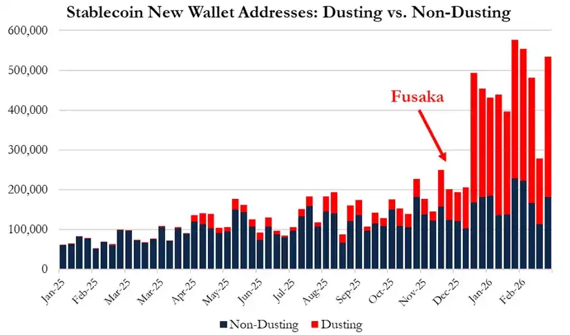 Realizamos un análisis completo de los datos en cadena de enero de 2025 a febrero de 2026, y los resultados muestran que lo que Lee llama "crecimiento de la actividad de Ethereum debido a la adopción institucional" en realidad puede explicarse por una gran cantidad de comportamientos de envenenamiento de direcciones (address poisoning) y ataques de polvo (wallet dusting) de bajo valor. Estos comportamientos fueron provocados por el exceso de espacio de bloques tras la actualización Fusaka.