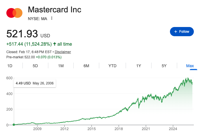 Y hoy, la red de Mastercard cubre más de 210 países y regiones, con una red de aceptación de más de 150 millones de comerciantes y más de 3.500 millones de tarjetas en circulación. Mastercard realizó una división de acciones 10:1 en enero de 2014. A un precio actual de aproximadamente 521.93 dólares, los inversores que poseían acciones de Mastercard obtuvieron un crecimiento de 134 veces en los últimos 20 años.