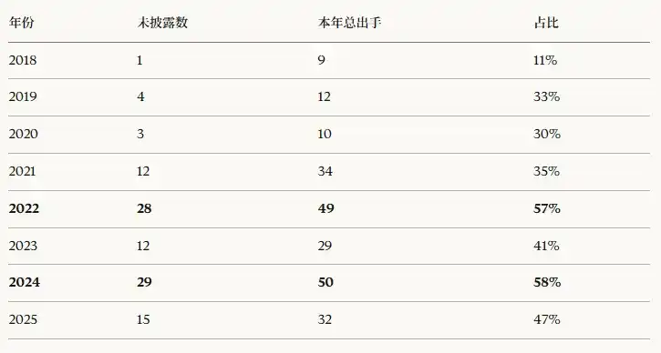 Esta规律 es intrigante. En mercados bajistas, es más reacio a revelar montos, probablemente por sensibilidad估值, y los proyectos no quieren exponer la dificultad para recaudar fondos; y en el pico alcista de 2024 la alta tasa de no divulgación se debe más a que la firma suprime activamente la información, para evitar que competidores sigan el paso.