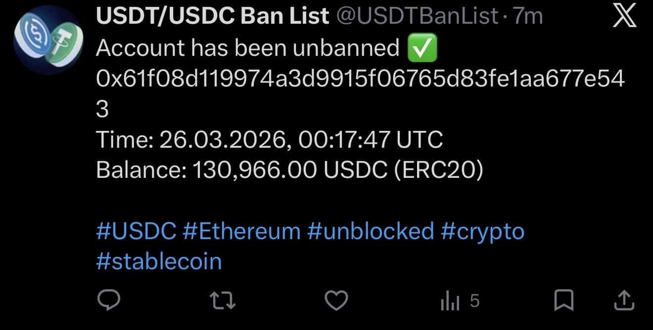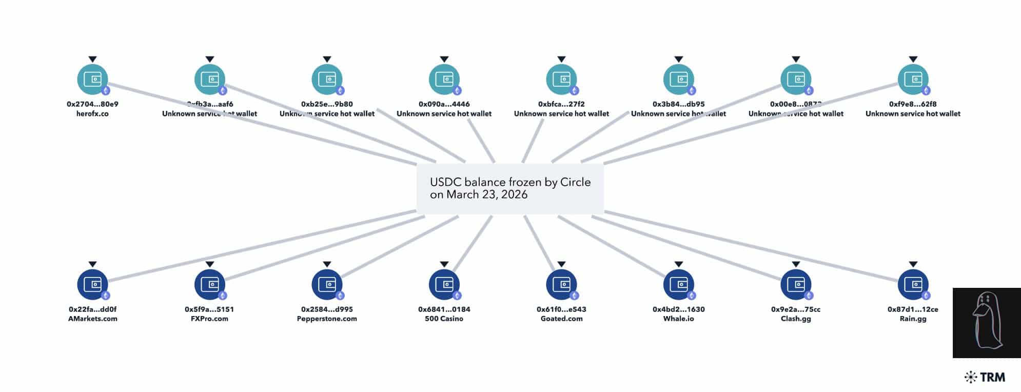Las congelaciones de carteras de USDC atrayeron escrutinio después de que el investigador on-chain ZachXBT señaló múltiples carteras vinculadas a exchanges afectadas el 23 de marzo de 2026.