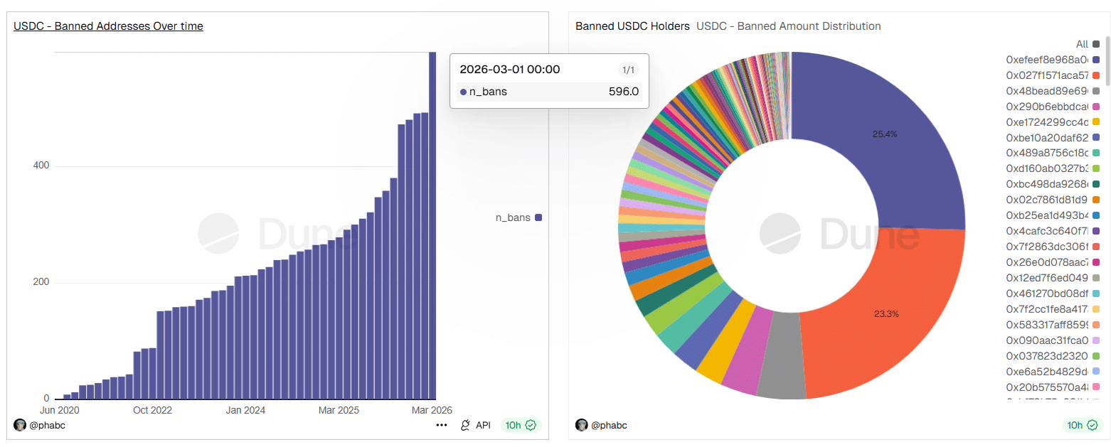 El recuento de listas negras de USDC alcanza 596 mientras se endurece el cumplimiento