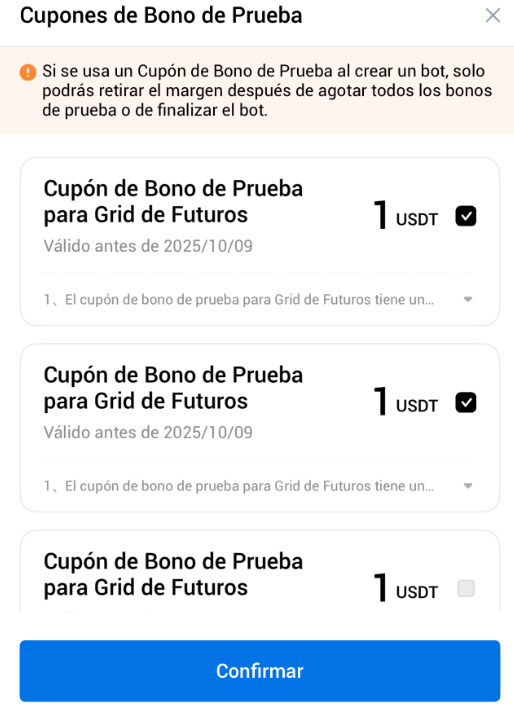 Los Cupones de Bono de Prueba para Grid de Futuros solo pueden utilizarse en bots de Grid de Futuros—ya sea en estrategias propias o copiando la estrategia de otro usuario.