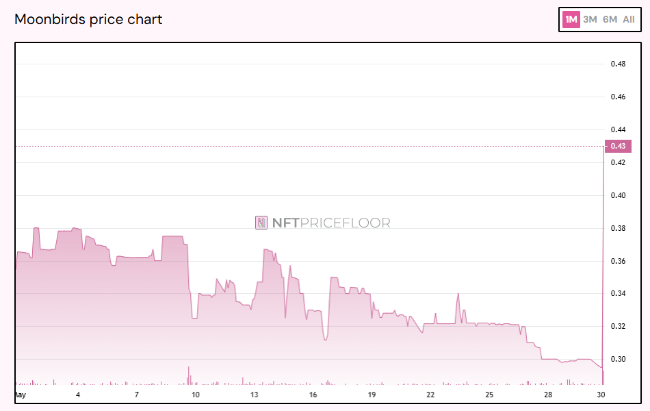 与 Crypto Punks 相比,Moonbirds 的系列规模相对较小,也不太成功。Moonbirds 的初始底价超过 28 ETH,最低跌至 0.30 ETH。IP 出售公告发布后,底价上涨至 0.43 ETH。