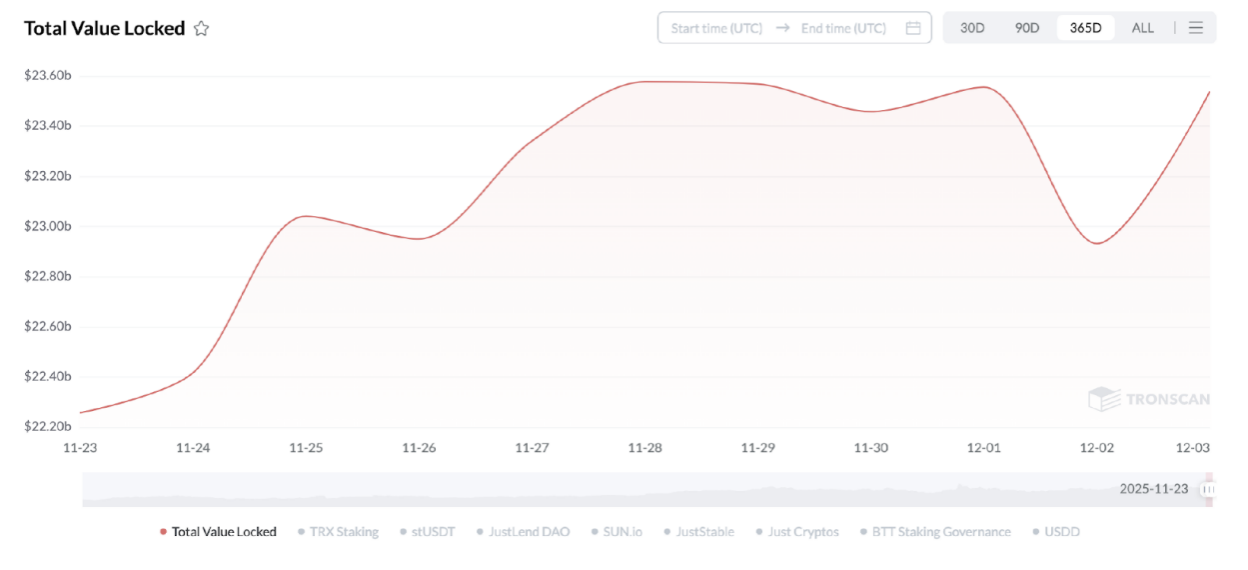 本次“五虎争霸交易赛”不仅是代币间的角逐,更成为了波场TRON生态实力的一次集中阅兵。最直观的印证来自链上数据:赛事期间,生态总锁仓价值(TVL)一路走高,峰值强势突破235亿美元。这一数字不仅彰显了生态强大的资金吸纳与留存能力,也为赛事的火热进行提供了深度的流动性支撑与市场信心,形成了“活动吸引资金,资金反哺活动”的强劲正循环。