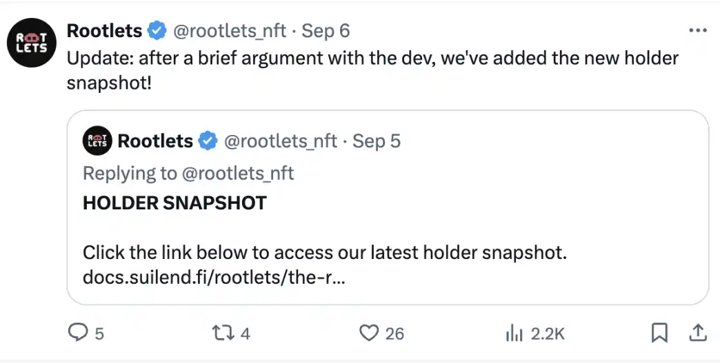 Rootlets 是 Suilend 创始人 Rooter 推出的 NFT 系列,目前地板价 112 SUI。持有 Rootlets 有机会收到 Suilend 代币空投吗?