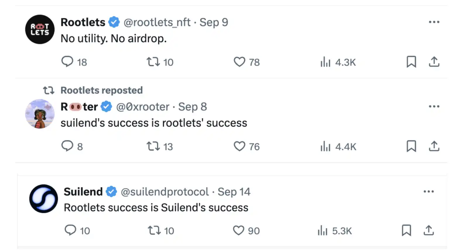 尽管 Rootlets 官方表示「不会有空投,不会有 Utility。」但 Rooter 说「Suilend 的成功就是 Rootlets 的成功。」,甚至 Suilend 也说「Rootlets 的成功就是 Suilend 的成功。」