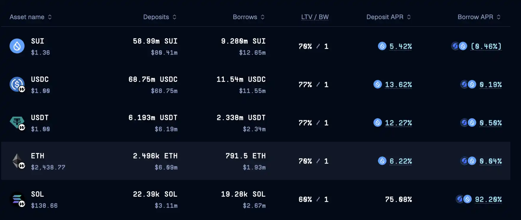提示:Sui 上的稳定币、ETH、SOL 都需要从虫洞跨入。图片中由于短期被借出大量 SOL 导致 SOL 利率飙升,SOL 利率多数时间为存入 0 ~7% 年化,借出低于 1% 甚至为负利率。由于存在借贷仓位,需要注意清算风险。