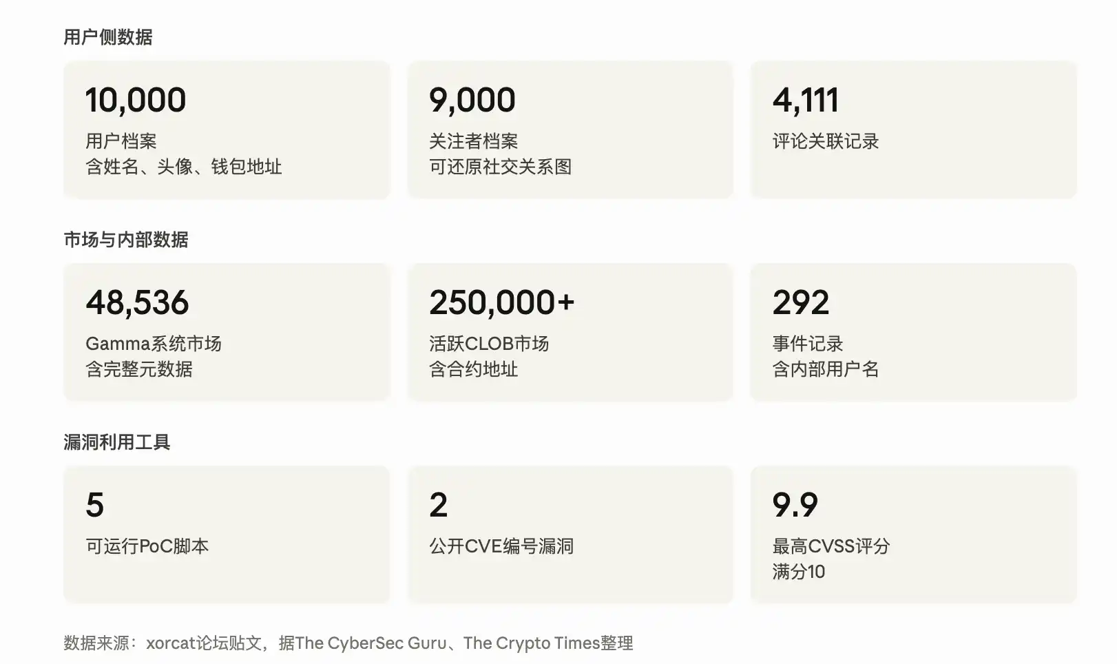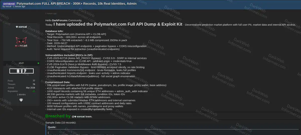4 月 27 日,化名「xorcat」的攻击者在某网络犯罪论坛上传了一份压缩包:8.3MB 的 JSON 文件,解压后达到约 750MB,内含逾 30 万条从 Polymarket 提取的记录、5 个工作中的漏洞利用脚本(PoC)以及一份技术报告。