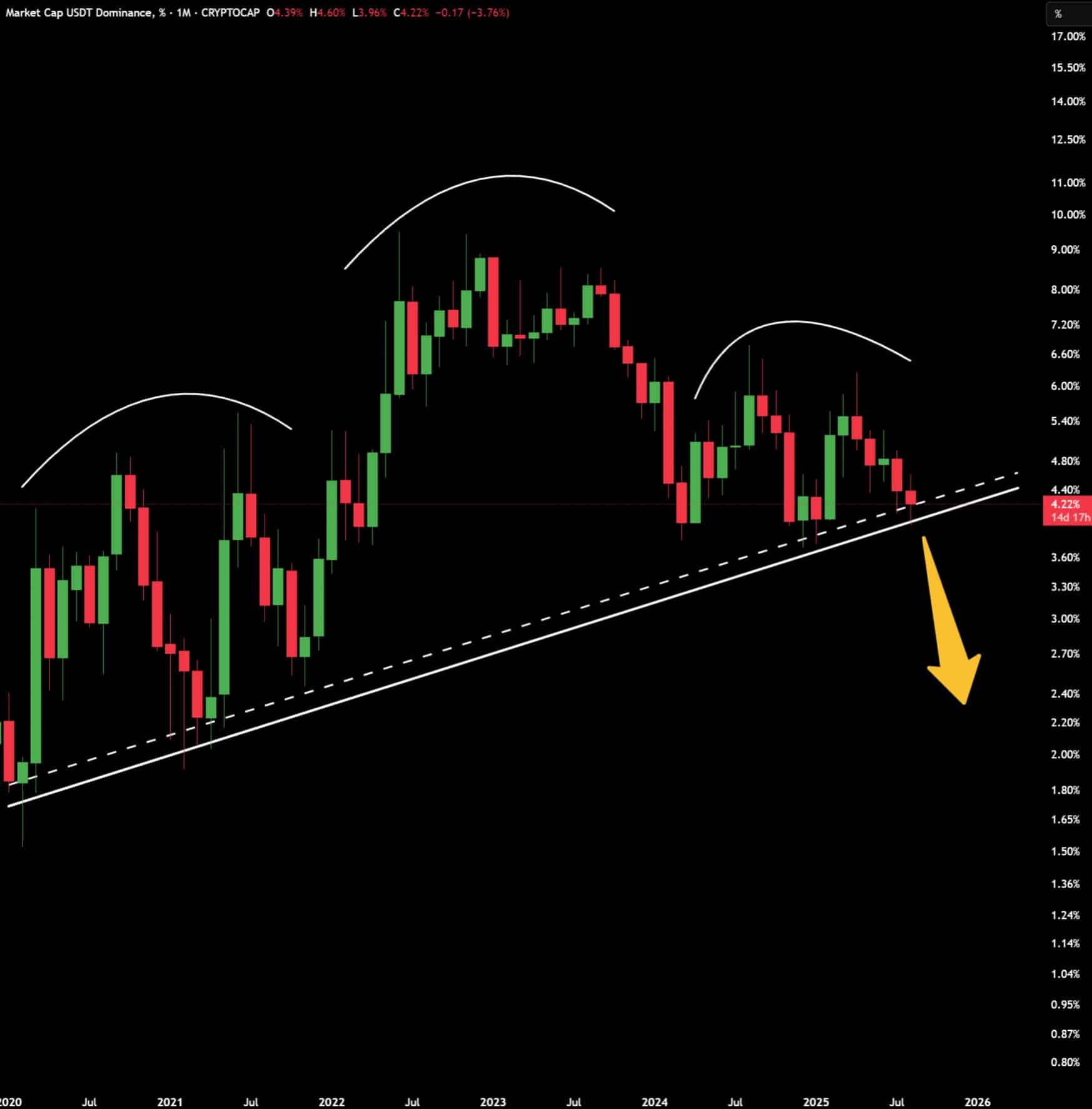 从分析来看,稳定币的主导地位(约为4.22%)已形成疲态。跌破头肩形态的颈线,可能开启一个完整的山寨币旺季。