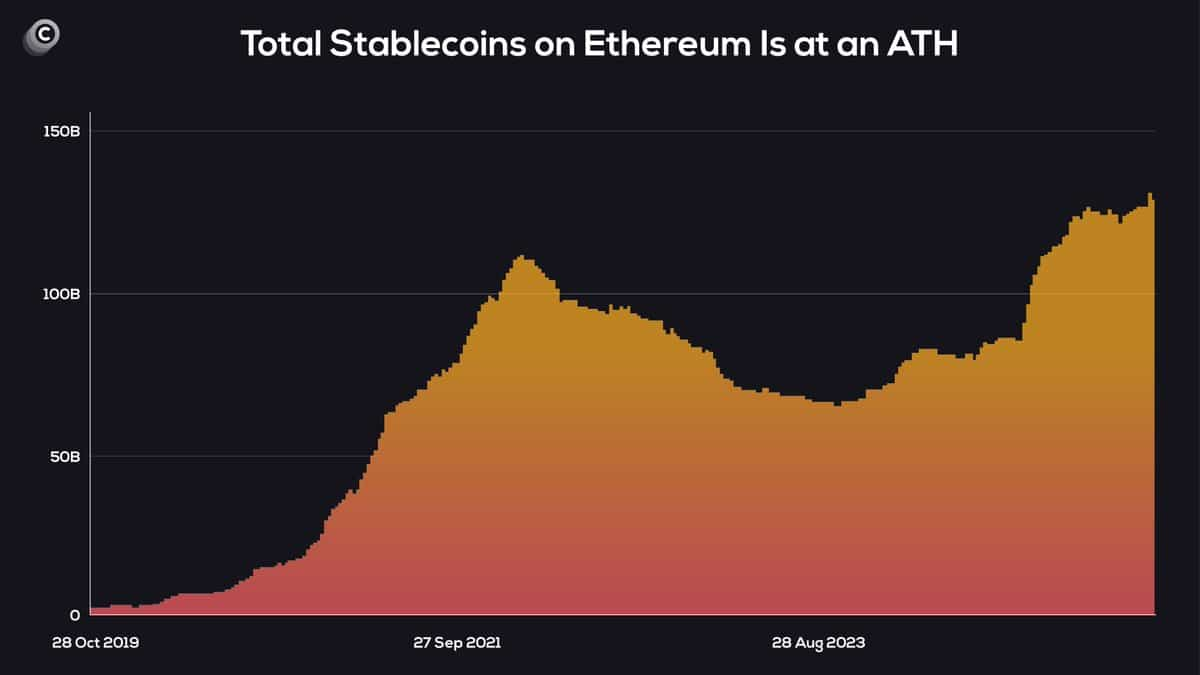 以太坊 [ETH]网络上的稳定币总量达到了约 1300 亿美元的历史最高水平。自 2023 年 8 月创下低点以来,这一趋势一直呈上升趋势。
