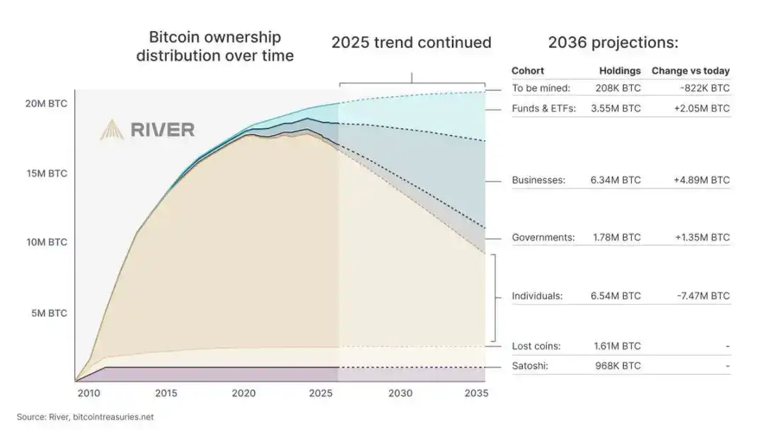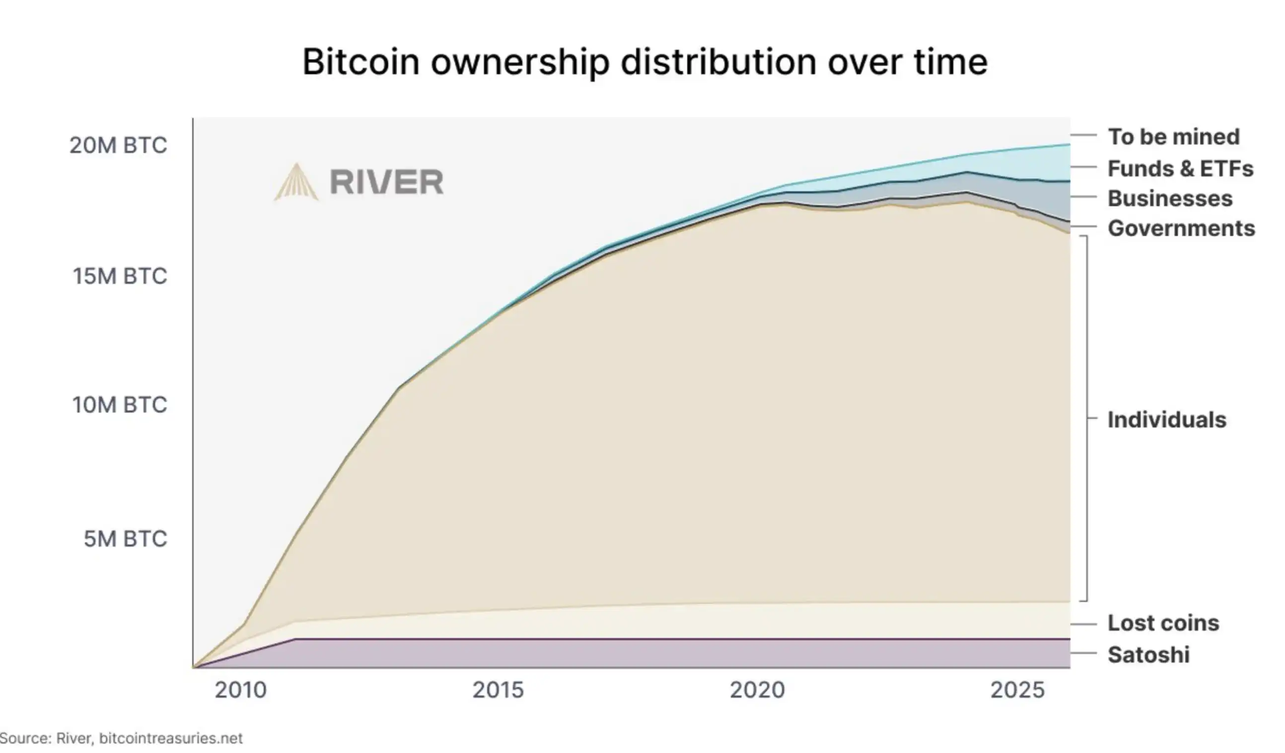 In 2025, the selling pressure mainly came from long-term holders and whales—early participants who built their positions years ago and are now gradually selling into a deeper, more liquid market. If this trend continues, institutions could hold the majority of the circulating supply within a decade, but currently, individuals still control about two-thirds of the supply.