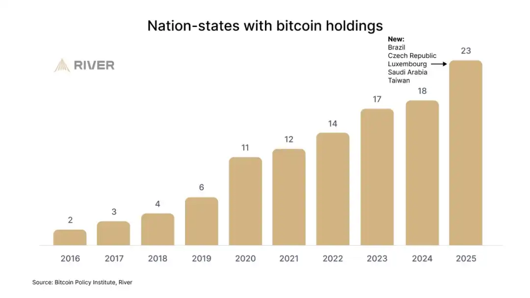 In 2025, 5 more countries became Bitcoin holders, including: 2 sovereign wealth funds (Luxembourg, Saudi Arabia) and 1 central bank (Czech National Bank).
