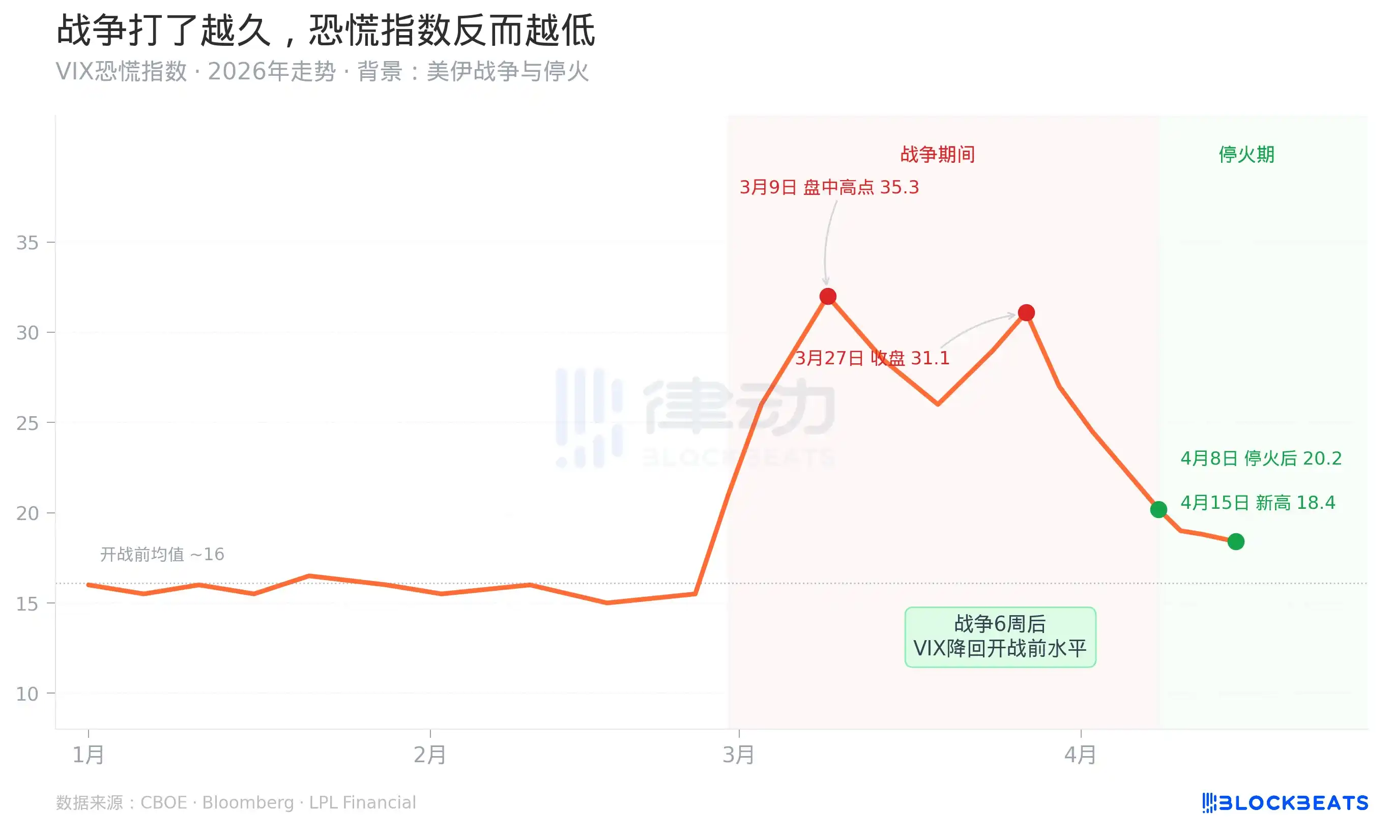 But the subsequent trend defies common sense. Starting from March 9, even as the war continued, oil prices rose, and the Senate voted on whether to authorize war powers, the VIX steadily declined. By April 15, the day the S&P hit its new record high, the VIX closed at around 18.4, lower than its level before the war started on February 28.