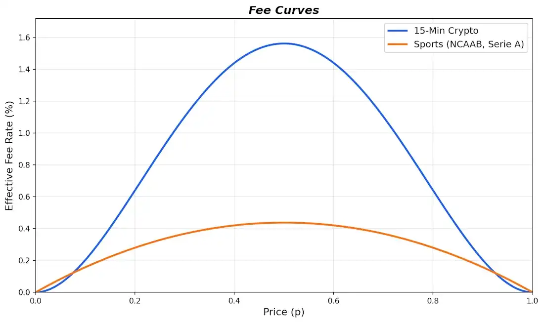 Simply put, the more uncertain the market, the higher the fee, peaking at 0.44% at a 50% probability, and dropping to only 0.13%-0.16% at probabilities of 10% or 90%.