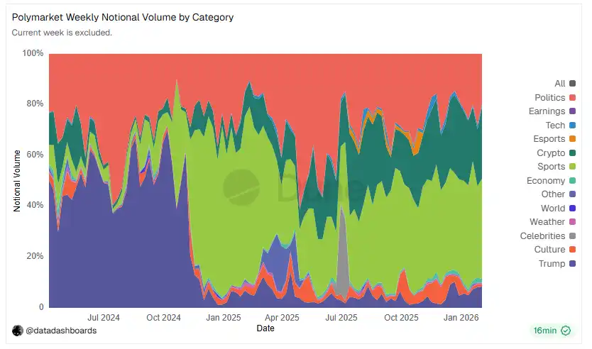 Taking the 2026 Super Bowl as an example, Polymarket's total trading volume in related markets reached approximately $795 million, covering various sub-markets such as game outcome, player performance, and halftime show predictions. The total weekly prediction market volume was once driven by sports events to break $6.3 billion.