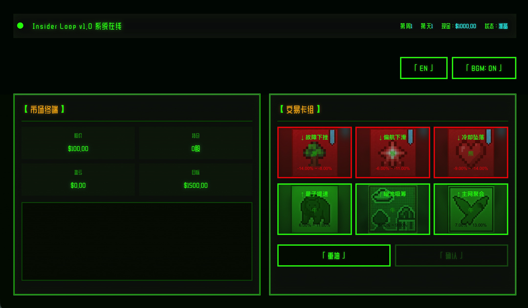 Project Introduction: A roguelike card strategy mini-game that融合 (fuses) the mechanics of "Balatro." Players influence price trends by constantly combining card effects, completing weekly escalating challenge goals amidst randomness and strategic gameplay. (Inspired by the game Insider Trading)